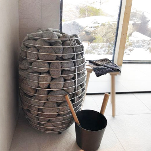 The HUUM Hive 18 kW heater works best with rounded olivine diabase stones sized between 2 and 4 inches (5–10 cm). Their robust nature and ability to hold heat effectively make them ideal for maintaining even, long-lasting sauna temperatures.