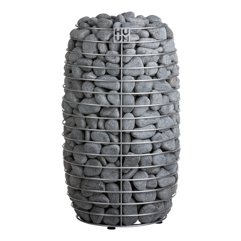 The HUUM Hive Mini 6 kW uses round olivine diabase stones, typically ranging from 5 to 10 cm (2 to 4 inches) in diameter, which are designed to enhance heat retention and steam quality.